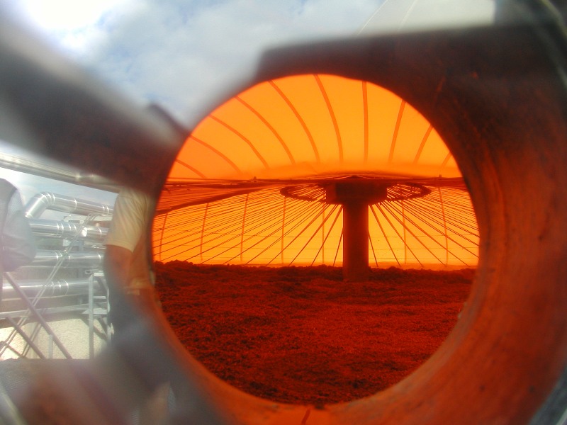 Sicht durch das Kontrollfenster auf die Schwimmschicht im Fermenter einer Biogasanlage.