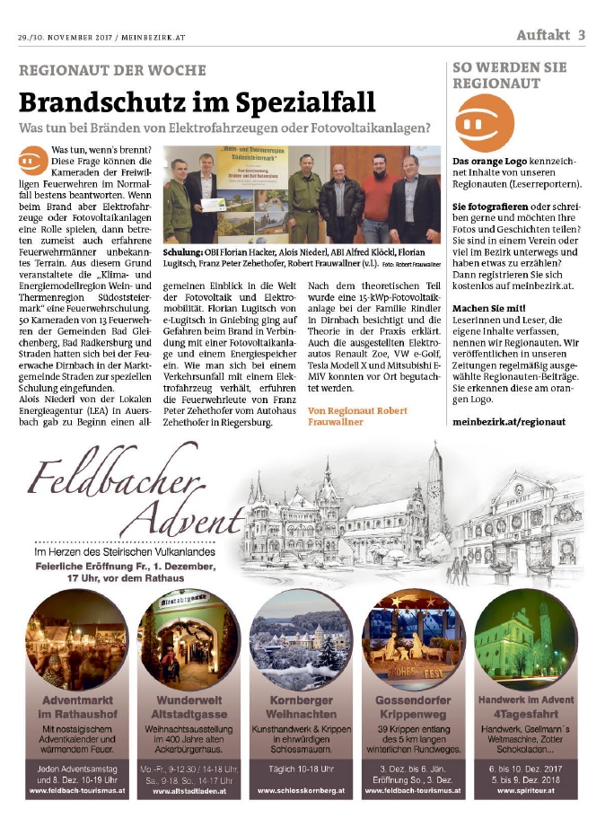 Brandschutz im Spezialfall, 29.11.2017, Die Woche von Lokale Energie Agentur | 1. Dezember 201727. März 2018 Presseartikel: Brandschutz im Spezialfall, 30.11.2017
