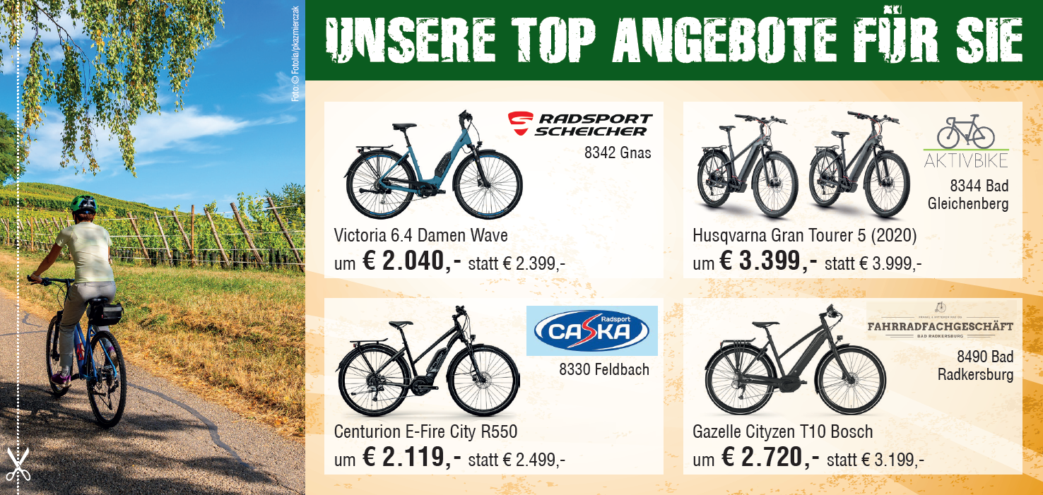 Die Gemeinden Bad Gleichenberg, Straden und Bad Radkersburg starteten gemeinsam mit den Partnerbetrieben Radsport Scheicher, Aktivbike, Radsport Caska und dem Fahrradfachgeschäft Bad Radkersburg mit einer besonderen Aktion in den Frühling: Mit dem E-Bike-Gutschein (der in der Gemeindezeitung und bei den Partnerbetrieben zu finden ist) erhalten Sie ein qualitativ hochwertiges E-Bike zum Modellregions-Sonderpreis!!!