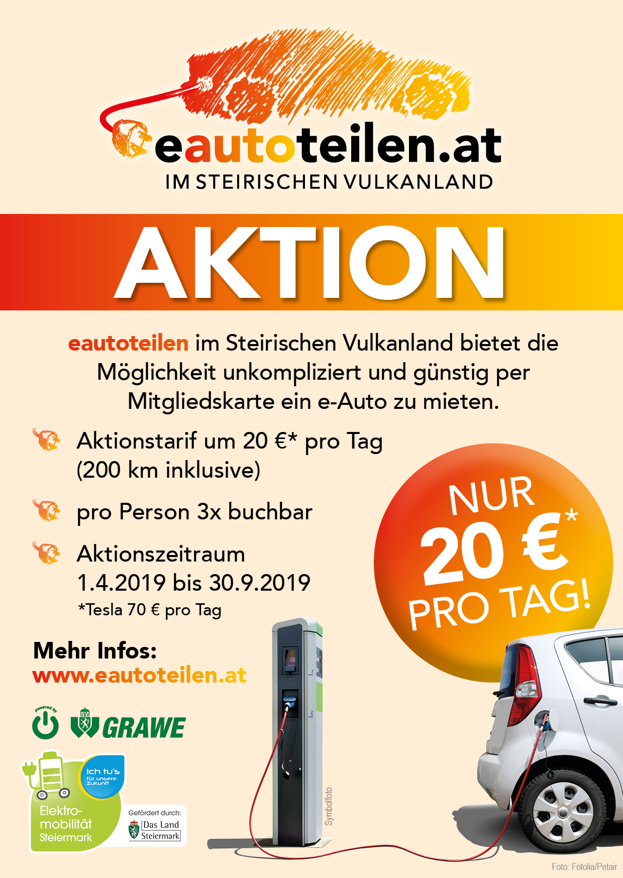Seit 2017 kooperieren 15 Partner im Vulkanland (Betriebe und Gemeinden) im Bereich der Elektromobilität. Neben der Investition in Elektrofahrzeuge und Ladestationen steht die gemeinschaftliche Nutzung von Elektrofahrzeugen im Vordergrund. 19 eAutos stehen an 17 Stationen (siehe Übersichtskarte) interessierten Personen (GemeindebürgerInnen, MitarbeiterInnen und der allgemeine Bevölkerung) zur Verfügung. Die Fahrzeuge können dabei über eine Buchungsplattform online oder per App reserviert werden, die Abrechnung erfolgt elektronisch. eautoteilen bewirkt eine optimale Nutzung von Fahrzeugen und kann überall dort eingesetzt werden, wo öffentlicher Verkehr nicht verfügbar ist oder Fuß- bzw. Radverkehr nicht möglich ist. Nähere Informationen zum eautoteilen finden Sie unter www.eautoteilen.at und bei allen teilnehmenden eautoteilen-Partnern.