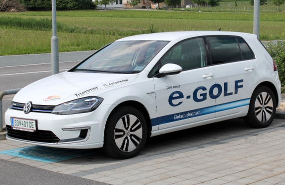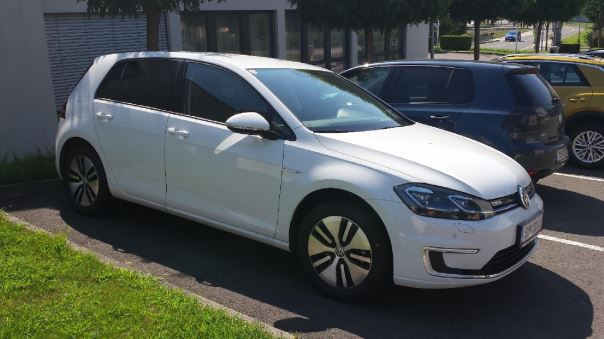 Das Autohaus Trummer in Feldbach bietet einen VW e-Golf, welcher am Parkplatz vor dem Verkaufsgebäude abgestellt ist.