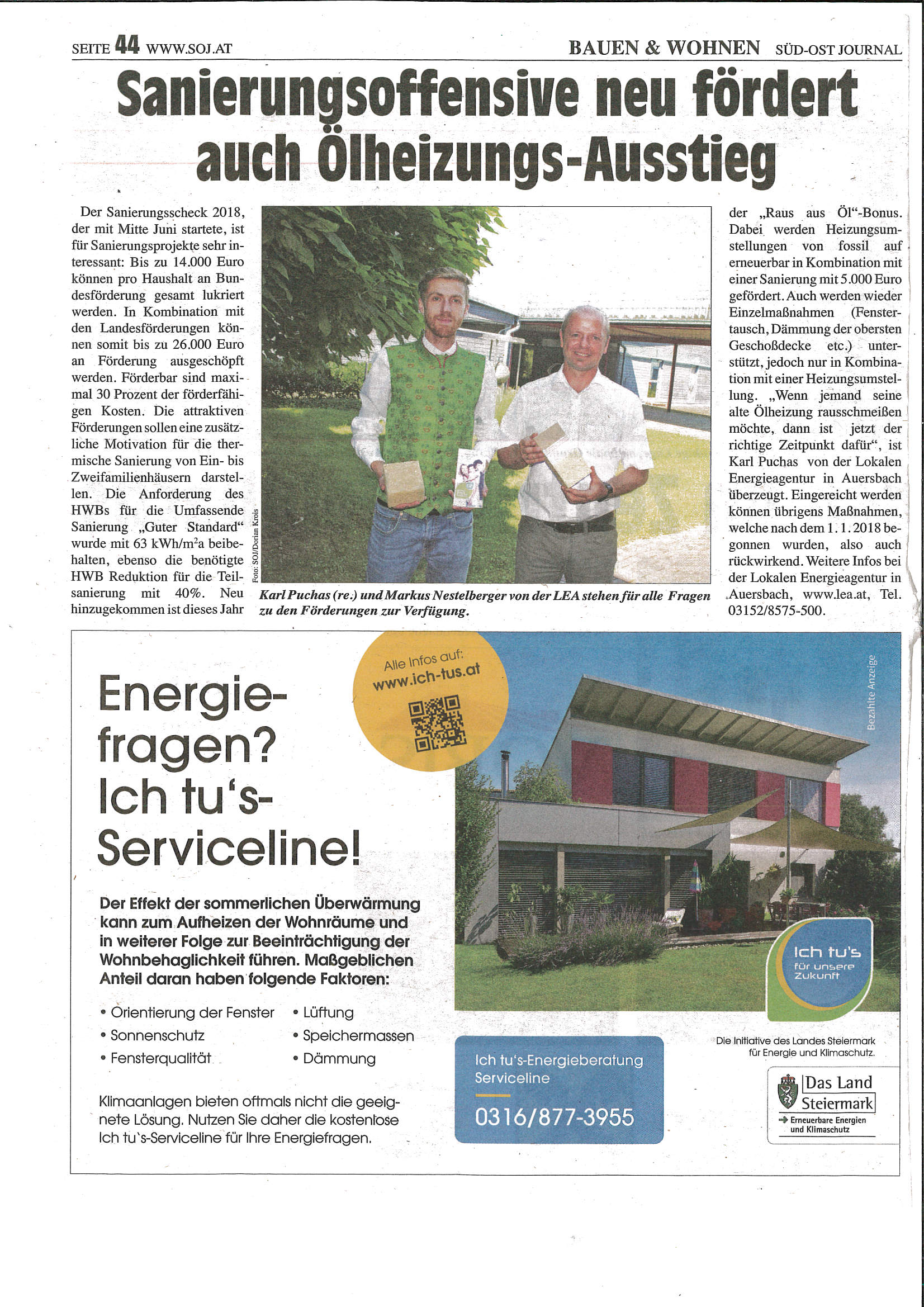 Sanierungsoffensive neu fördert auch Ölheizungs-Ausstieg, Süd-Ost-Journal, 11.7.2018 von Lokale Energie Agentur | 23. Juli 201823. Juli 2018